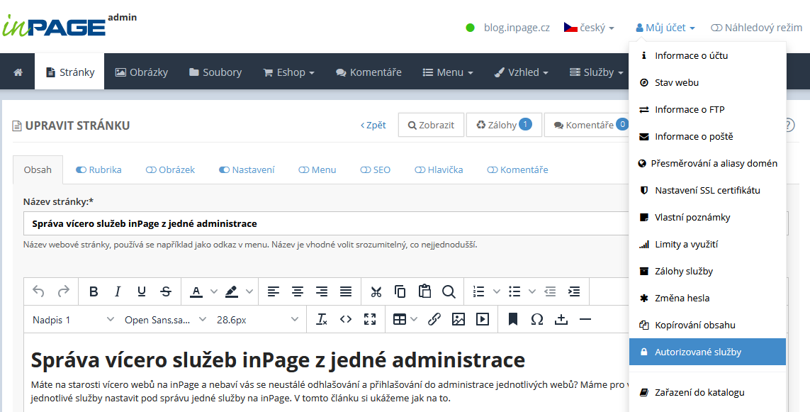 Správa vícero služeb inPage z jedné administrace