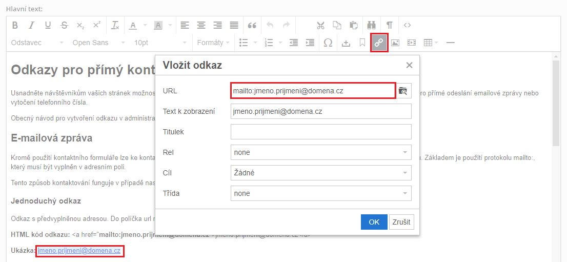 Odkaz s vyplněnou emailovou adresou. Do políčka url nejdříve vepište mailto: a poté emailovou adresu.