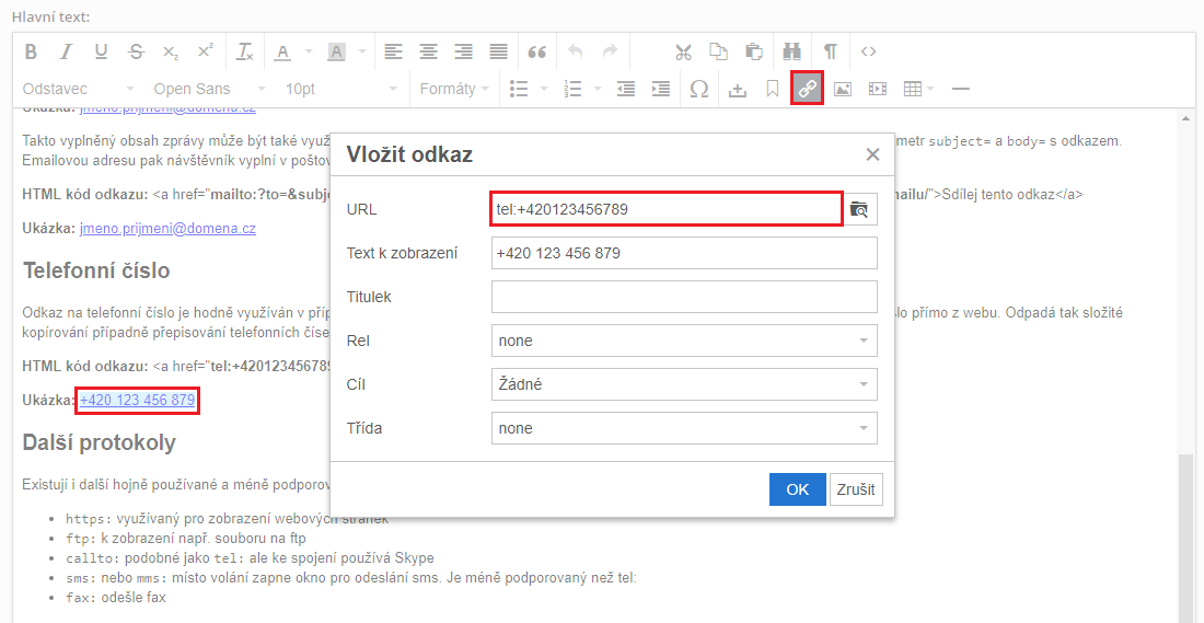 HTML kód odkazu: <a href="tel:+420123456789">+420123456789</a>