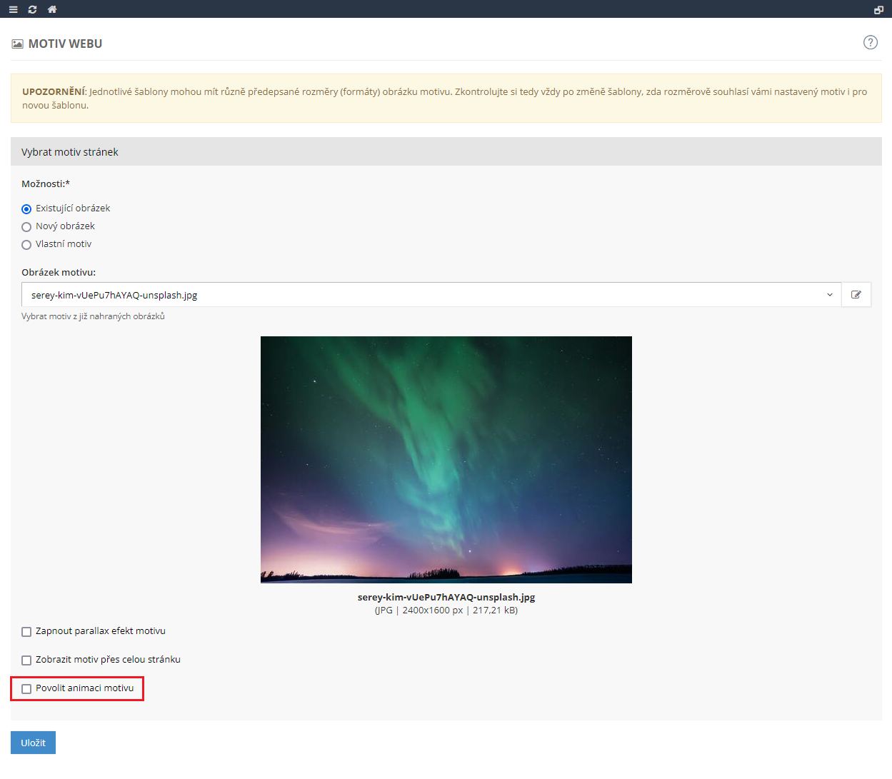 U šablony AURORA máte k dispozici již několik možností nastavení pro hlavní obrázek webu (motiv). Jednak je to možnost roztáhnout motiv přes celou stránku, dále pak možnost aktivovat paralax efekt motivu a nově můžete nastavit i animaci obrázku motivu.