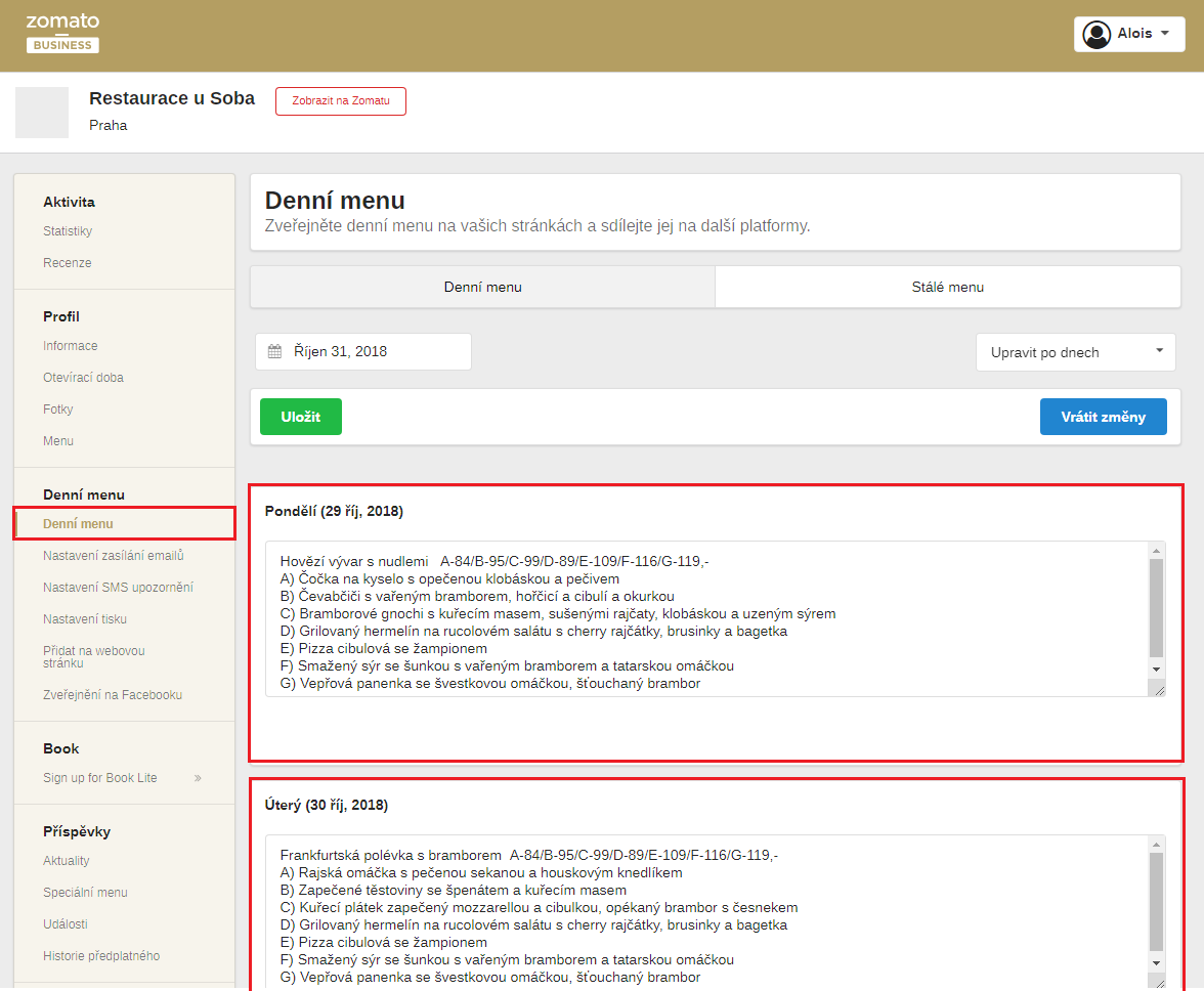 V administraci profilu restaurace přejděte na část Denní menu, kde do jednotlivých textových poli, představujících dny v týdnu, vepište vaši nabídku jídel a uložte.