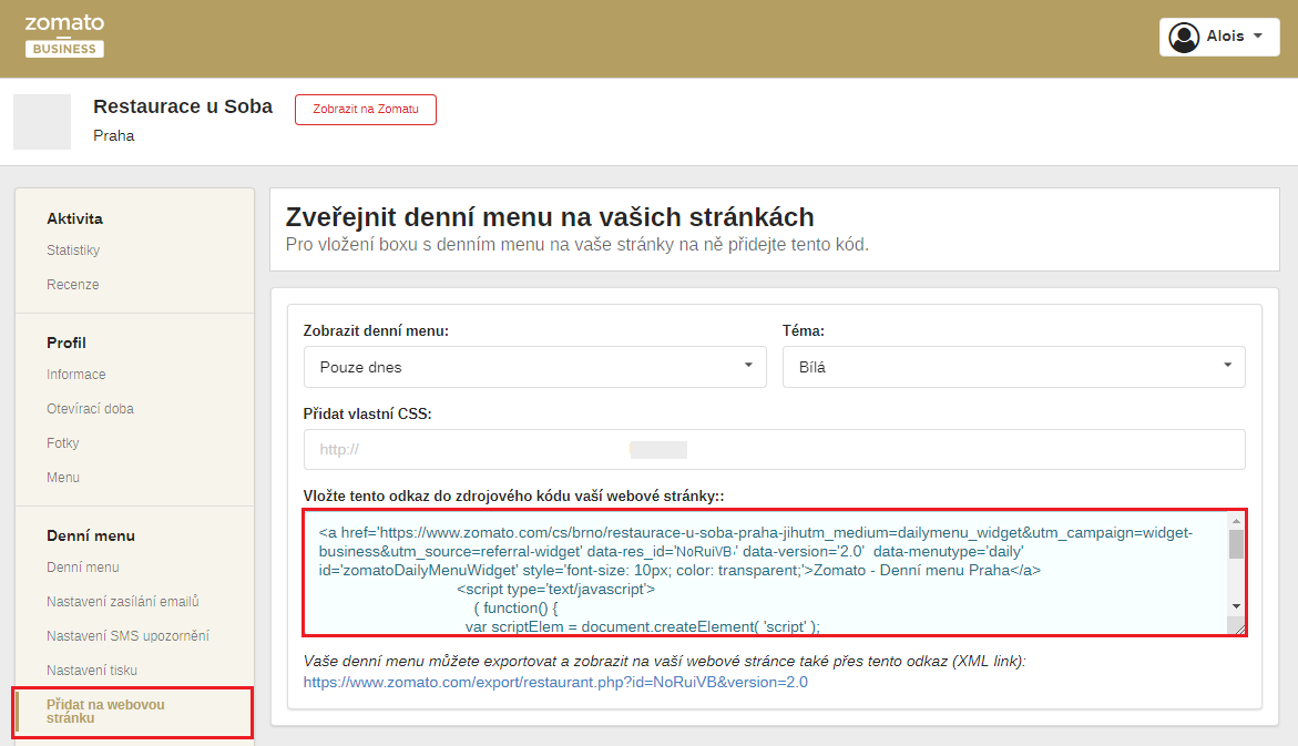 Kód pro vložení denního menu na vaše webové stránky vygenerujete pod odkazem Přidat na webovou stránku. Bohužel se nám tento způsob vložení denního menu do webu neosvědčil a níže nabízíme alternativní možnost, jak denní menu od Zomato.com na webu zveřejnit.