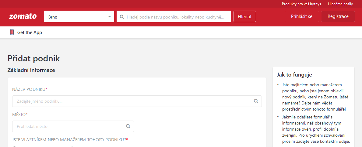 Nejdříve je třeba prověřit, není-li již profil vaší restaurace na Zomato.com vytvořen a přihlásit se k již existujícímu profilu. Pokud zde svou restauraci nenaleznete, profil restaurace vytvořte.
