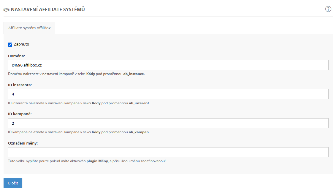 E-shop na inPage lze propojit s affiliate systémem Affilbox. Jedná se o provizní systém, s jehož pomocí si zakládáte vlastní síť obchodních partnerů a za to, že propagují váš produkt či služby, je jednoduše odměňujete. Více v článku Prodávejte pomocí affiliate systému Affilbox