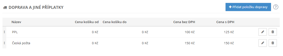V této kategorii můžete definovat různé dopravce, jejich ceny a případné slevy.zásilkovnu.