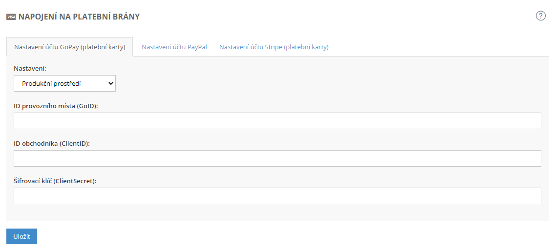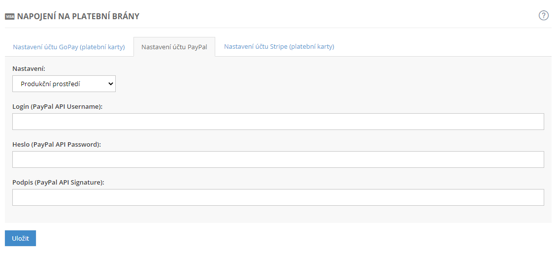 Systém inPage je připraven na implementaci plateb pomocí služby PayPal i akceptaci platebních karet přes platební bránu GoPay. Pokud chcete na vašem e-shopu využít těchto druhů plateb, je třeba si aktivovat účty přímo u těchto společností. Ty vám poskytnou kódy potřebné pro propojení s inPage e-shopem.