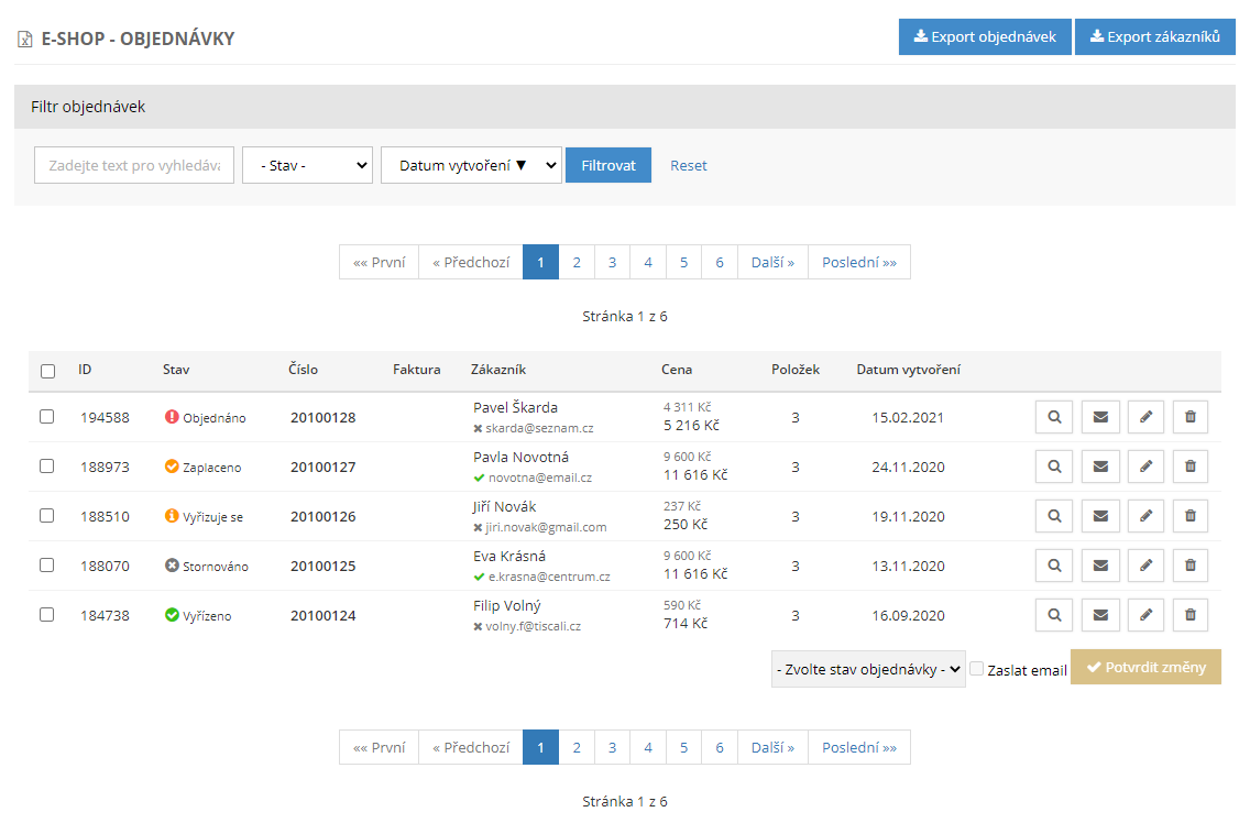 Pod touto položkou je seznam provedených objednávek, které lze upravovat, mazat či jim měnit stav. Objednávky je možné filtrovat nebo je vyexportovat. Nechybí ani možnost hromadných změn stavů.