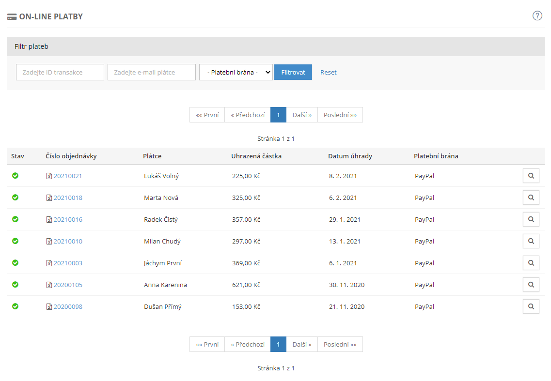 Nabízí seznam úspěšně dokončených elektronických plateb přes on-line platební rozhraní.