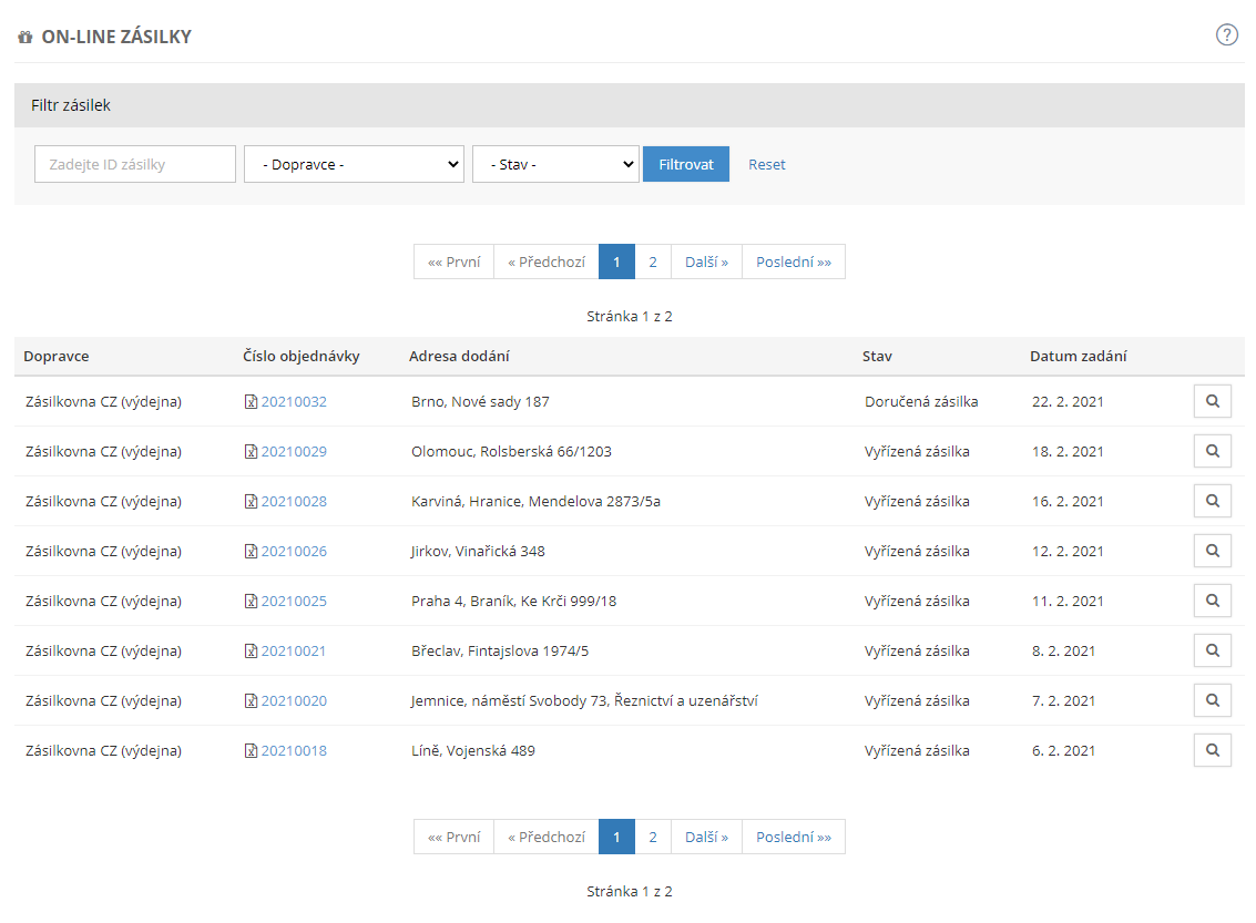 Seznam online zásilek přes dopravce zásilkovna.