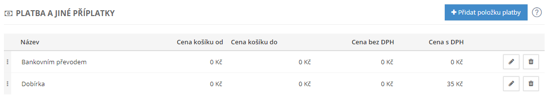 Možné je zadat jednotlivé způsoby plateb a propojení plateb s dopravou.
