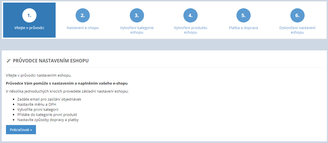 Náš průvodce vám pomůže s konfigurací vašeho e-shopu a vložením potřebného zboží. V několika jednoduchých krocích tak nastavíte e-mail pro zasílání objednávek, měnu, výši DPH, základní kategorii zboží, způsob dopravy a platby.