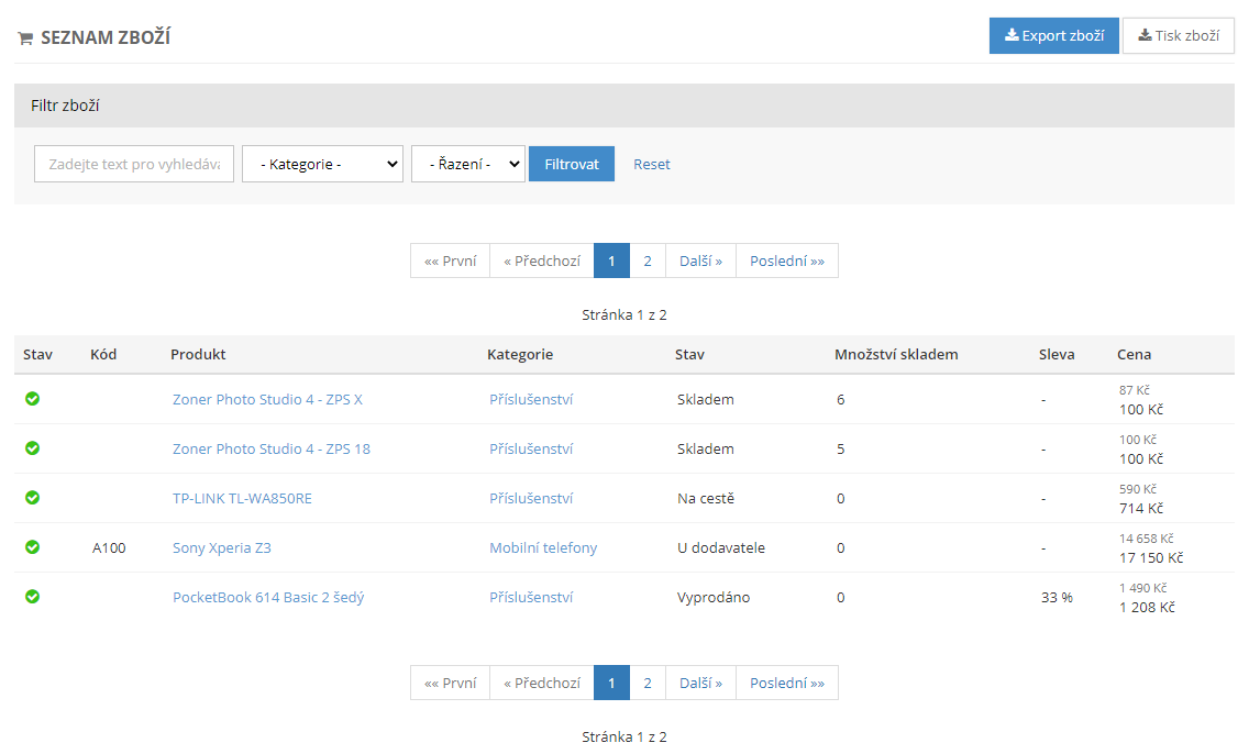 V seznamu zboží najdete všechny produkty vašeho e-shopu. Zboží je možné vyexportovat do souboru .csv nebo filtrovat dle názvu nebo kategorie.