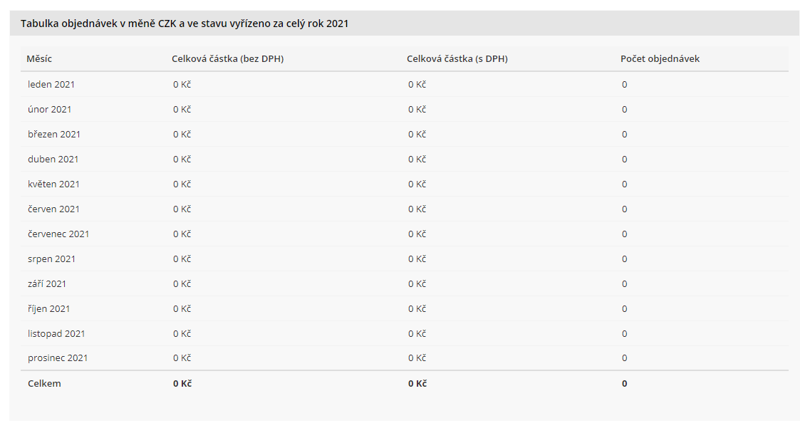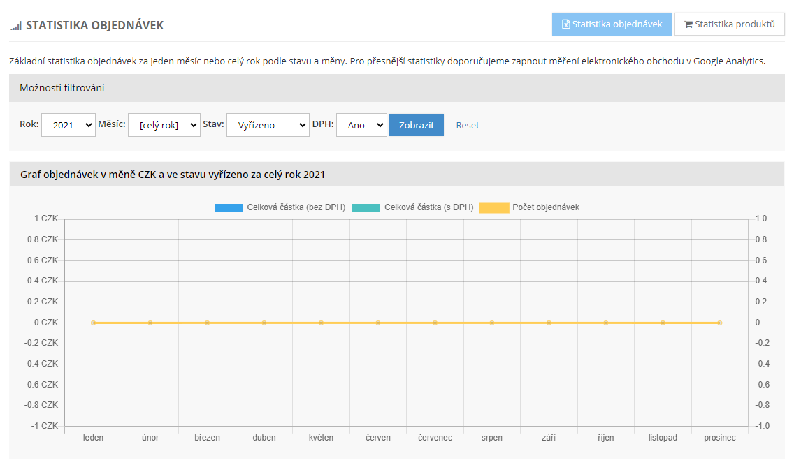Základní statistika objednávek za jeden měsíc nebo celý rok podle stavu a měny. Pro přesnější statistiky doporučujeme zapnout měření elektronického obchodu v Google Analytics.
