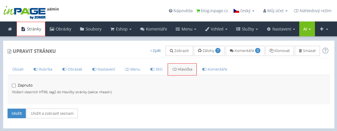 - Jedná se o textové pole, které slouží k zadávání scriptů nebo HTML tagů do hlavičky dotyčné stránky, rubriky apod.