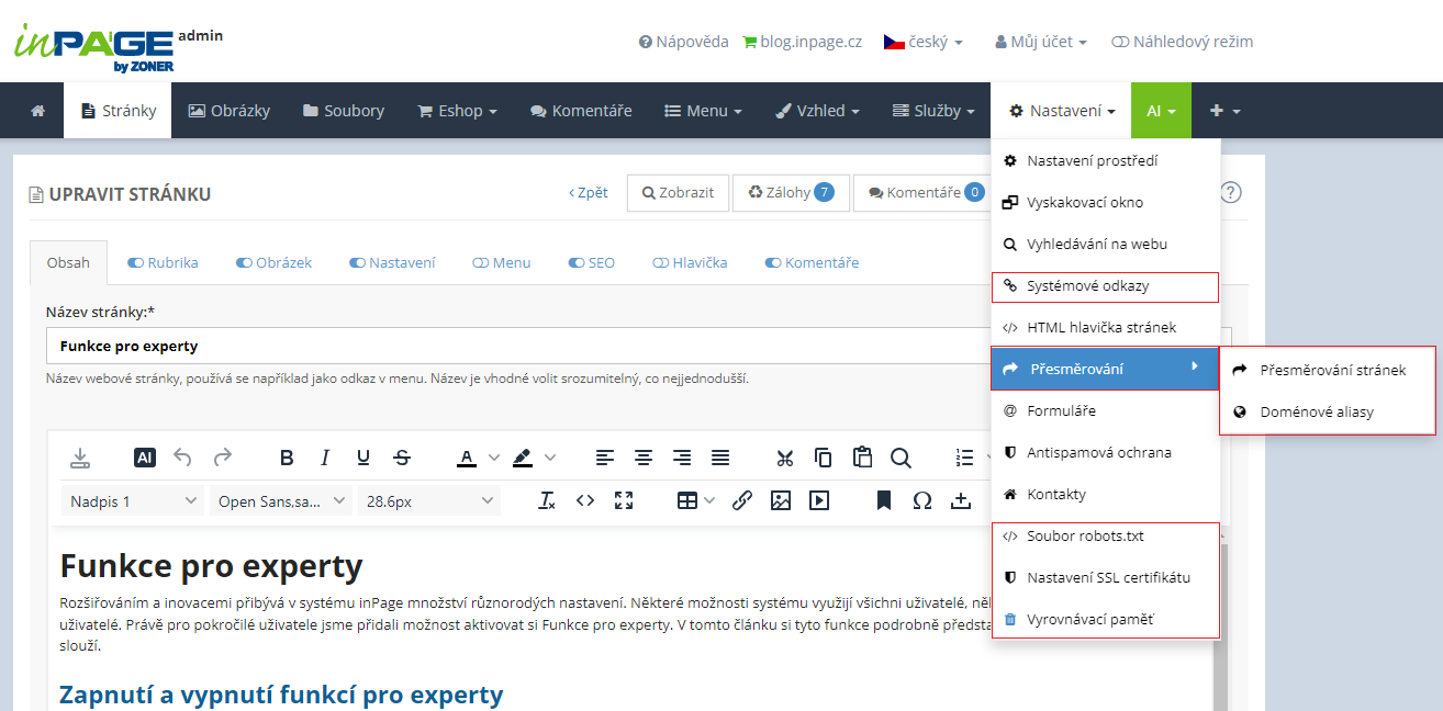 Zapnutím funkcí pro experty se objeví nové položky v sekcích Nastavení, Můj účet, Vzhled a záložka Hlavička u stránek, rubrik, galerií, složek souborů, kategorií a produktů v e-shopu.