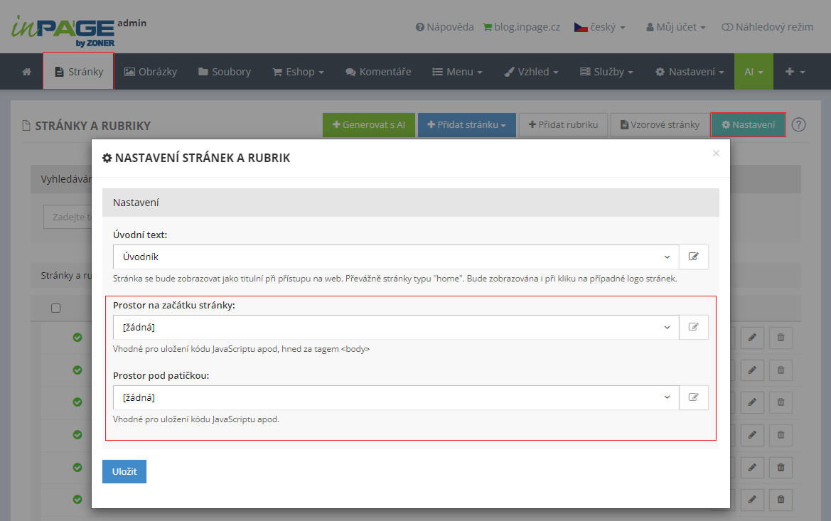 Někdy potřebujete do webu vložit script, který chcete mít obsažen ve všech stránkách. K tomuto účelu jsou v sekci Stránky pod tlačítkem Nastavení pole pro výběr stránky s vámi vloženým scriptem více viz Vložení scriptu na všechny stránky.