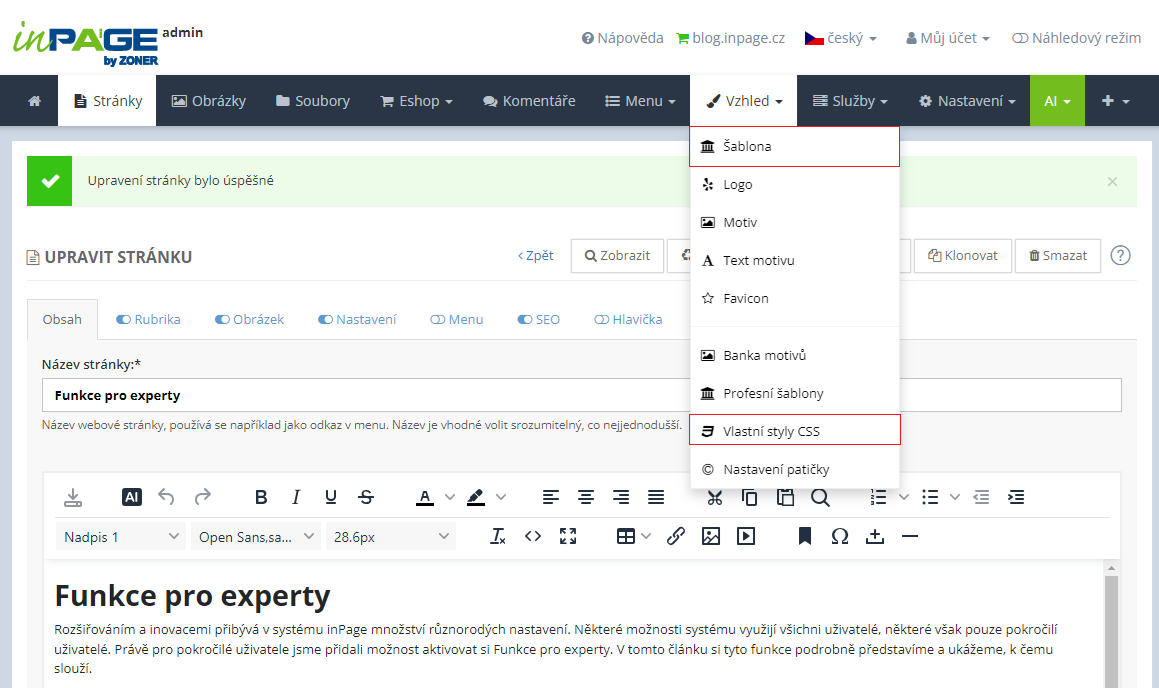 V případě, že používáte profesní šablonu, zapínají funkce pro experty položky Vlastní CSS styl a Šablony.
