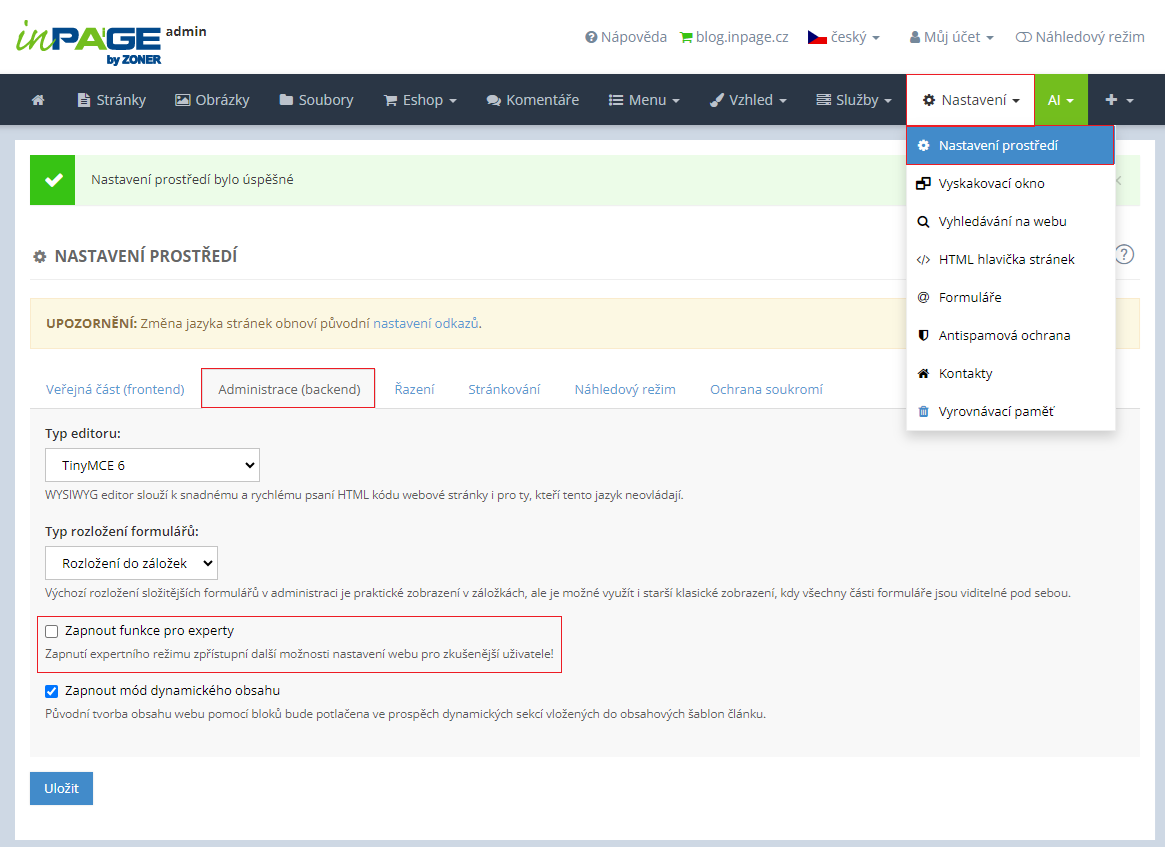 V základu při objednávce systému inPage jsou funkce pro experty vypnuté. Zapnout si je můžete v sekci Nastavení → Nastavení prostředí na záložce Administrace.