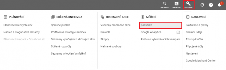 Přihlaste se k účtu Google Ads a klikněte v pravém horním rohu na ikonu klíče a v části Měření klikněte na Konverze.