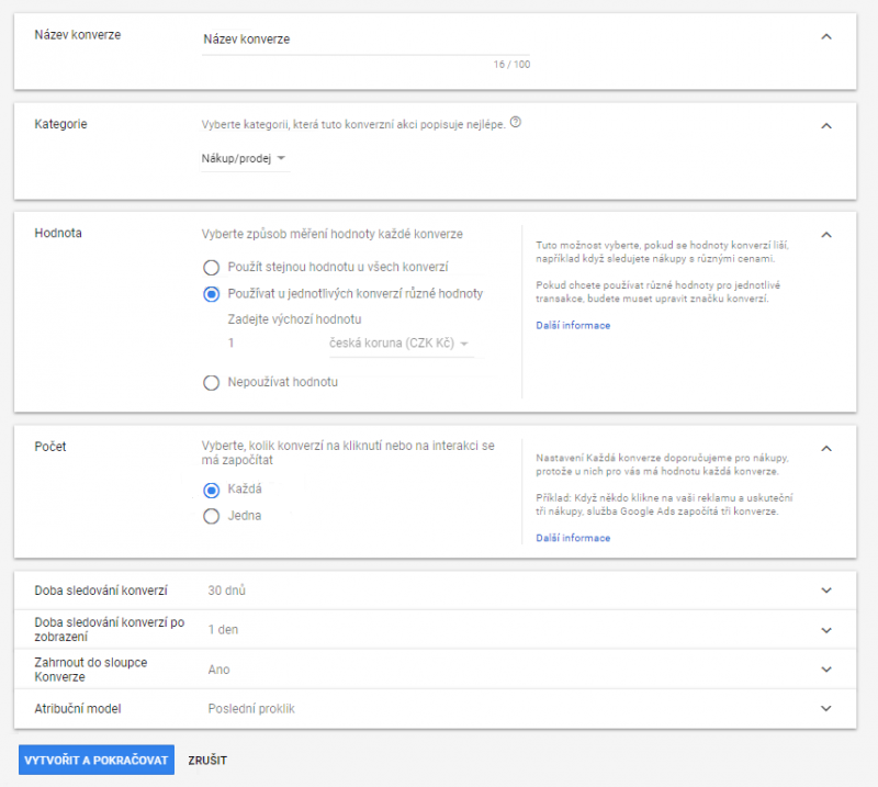 - Název konverze by měl vystihovat, co konverzí měříme, abychom ji pak snáze našli