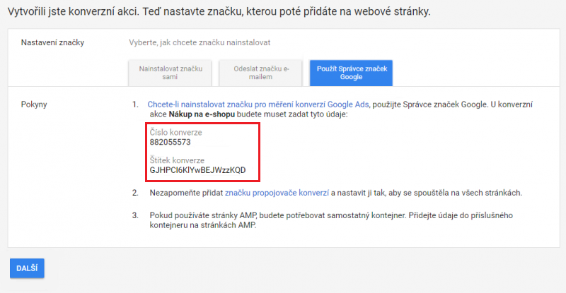 Na potvrzující obrazovce zvolte záložku Použít správce značek Google, kde jsou přehledně zobrazeny ID konverze a štítek konverze