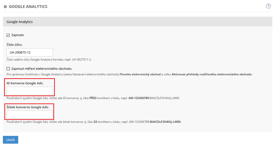 Jakmile získáte ID konverze a štítek konverze, přejděte do administrace inPage do sekce Služby → Google Anlalytics, zadejte do příslušných políček ID konverze a štítek a uložte.