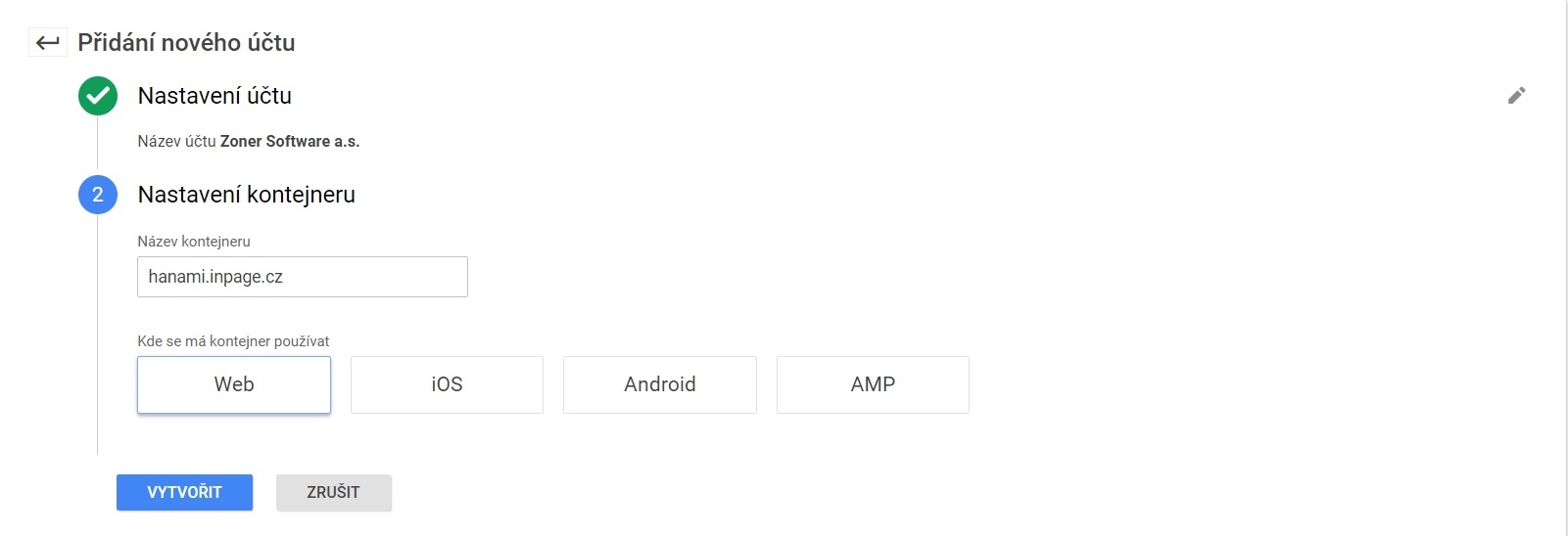 3. Zadáme název účtu a následně název kontejneru, neboli webu, kde ho budeme používat