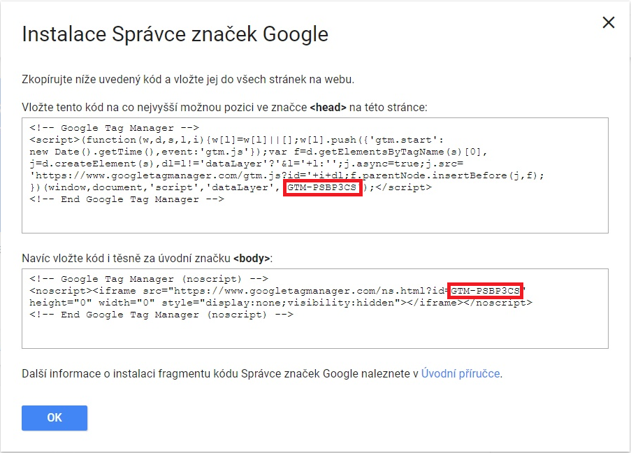 4. Po vytvoření a přijmutí smluvních podmínek obdržíme kód, u kterého nám postačí zkopírovat jen na obrázku označenou kombinaci čísel a písmen začínající tvarem GTM