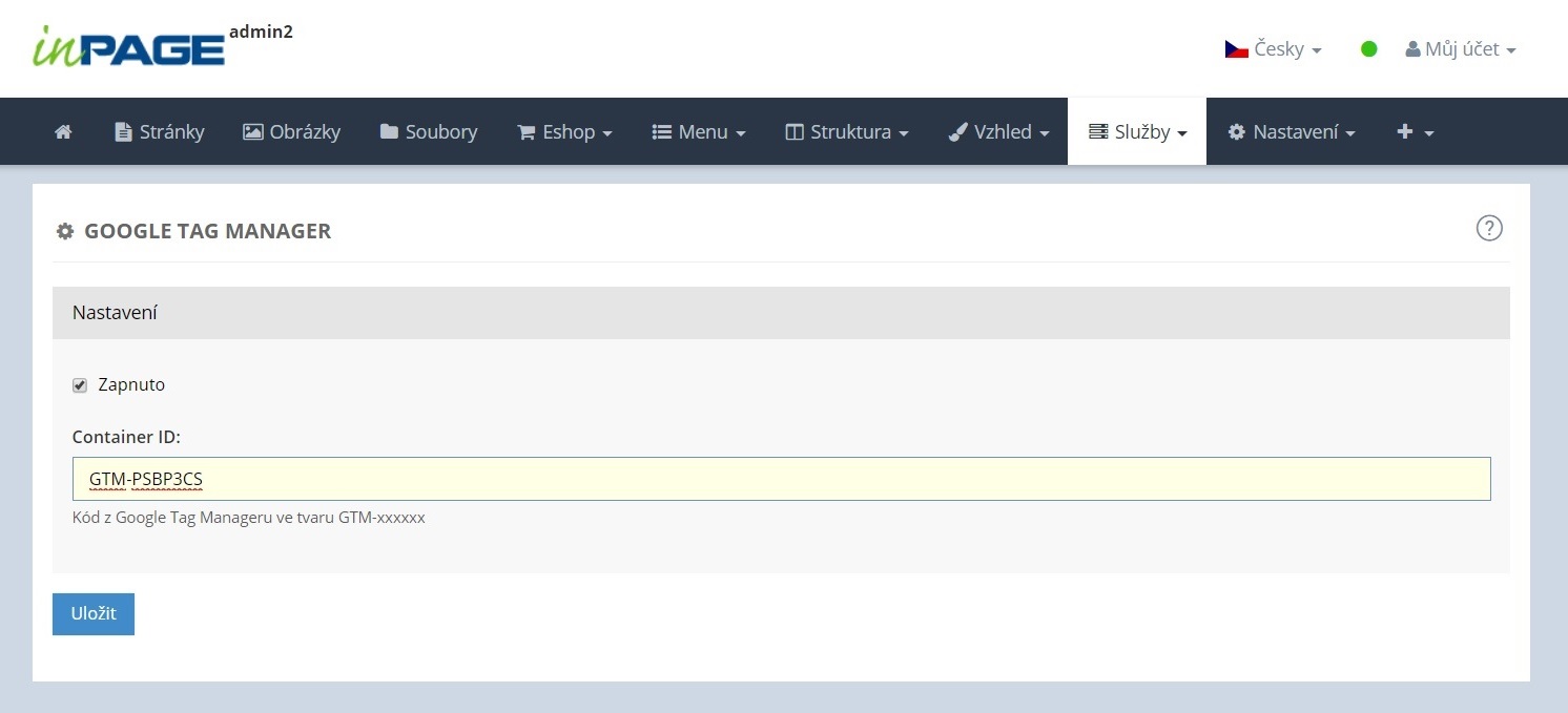 5. Tento kód následně zkopírujeme a vložíme do administrace v sekci Služby → Google Tag Manager