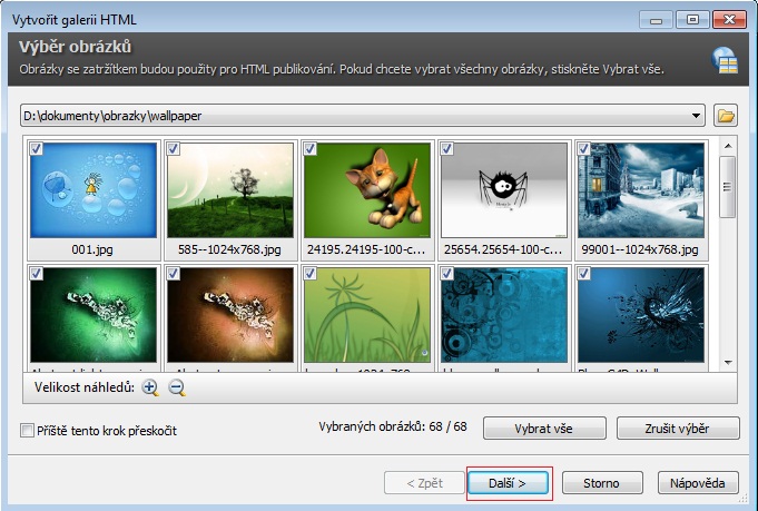 V tomto okamžiku se otevře nové okno s obrázky, které budou použity pro HTML publikování. Pokud některé obrázky ve fotogalerii zobrazit nechcete, pak zatrhnutím daného obrázku zrušte jeho výběr a publikovat se budou pouze označené obrázky.