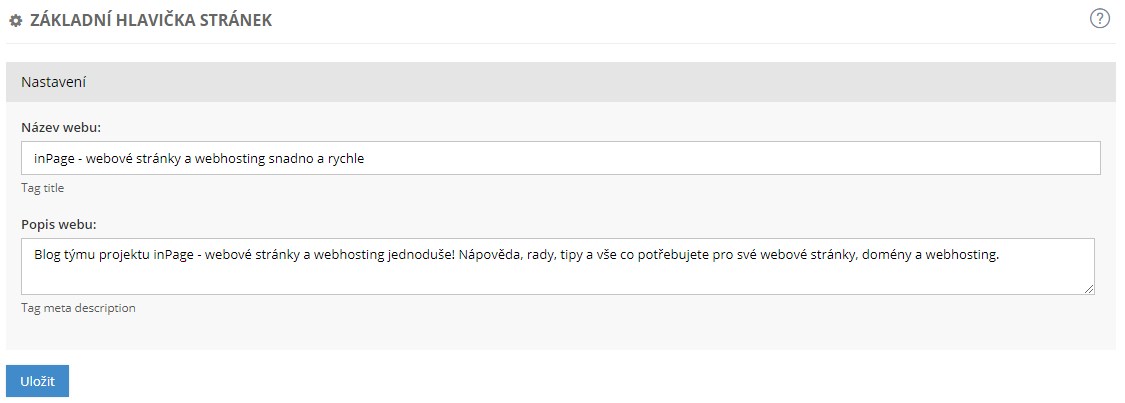 Jakmile máte všechny údaje vyplněny, klikněte na tlačítko Uložit. Systém inPage se pak již postará, aby se zadané texty objevovaly na příslušném místě v HTML kódu vašich webových stránek. Ovšem nezkoušejte zadané údaje najít při pohledu na svůj web. Jsou ukryty v té části kódu stránky, která není běžně zobrazována.