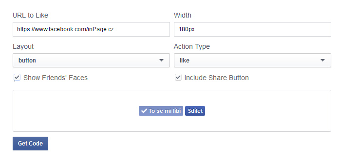 Po vyplnění políček ve formuláři vše dokončíte stiskem tlačítka GET CODE. Zobrazí se tabulka se zdrojovými kódy tlačítka "To se mi líbí".