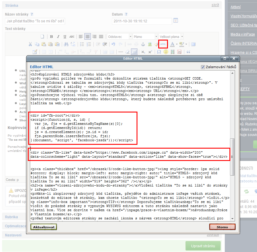 Vložení tlačítka "To se mi líbí" do stránky v inPage