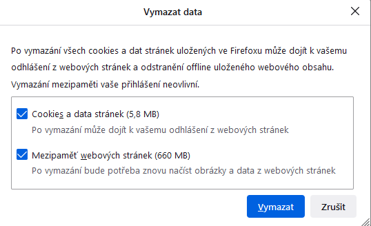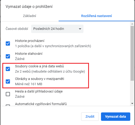 Následně vyberete Cookies a data stránek a Mezipaměť webových stránek a klikněte na tlačítko Vymazat.