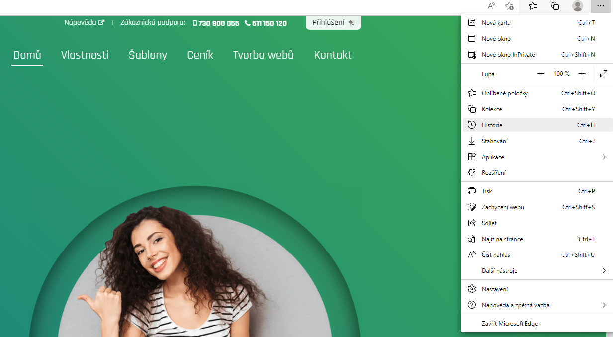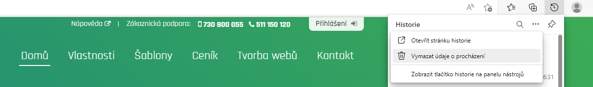 Pro vymazání cache v prohlížeči EDGE kliknete v pravém horním rohu tři tečky a vyberete možnost Historie.