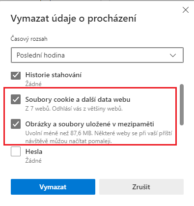 Následně vyberete údaje, které chcete smazat. Pro potřeby vymazání cache zaškrtněte položky Soubory cookie a Obrázky a soubory v mezipaměti a poté klikněte na Vymazat data.