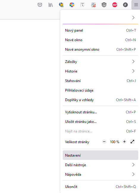 Abyste vymazali cache v prohlížeči Mozilla Firefox kliknete v pravém hormím rohu na tři čárky a vyberte možnost Nastavení.