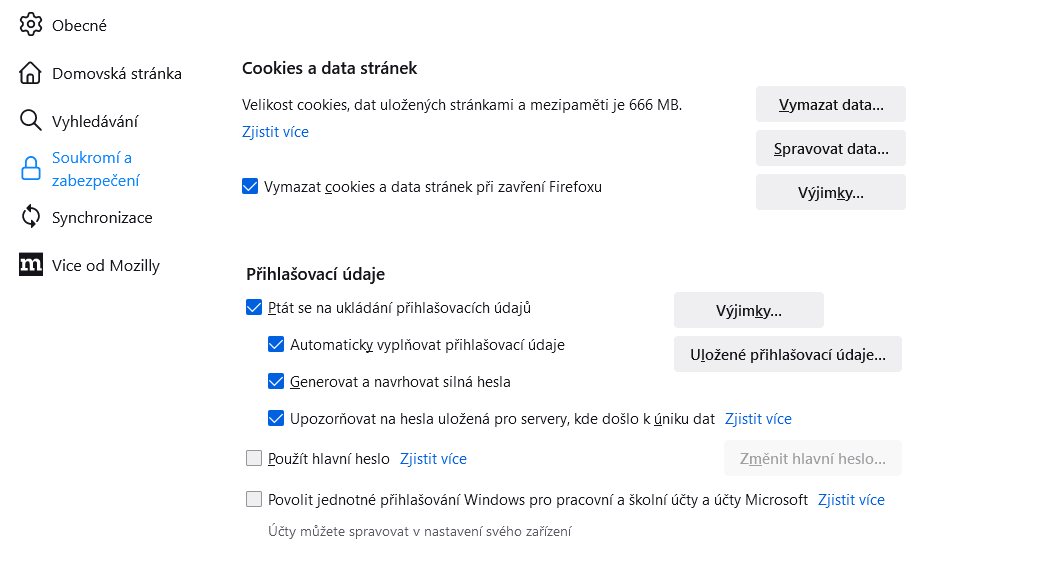 Poté vyberete sekci Soukromí a zabezpečení a zde v nastavení Cookies a data stránek kliknete na tlačítko Vymazat data.