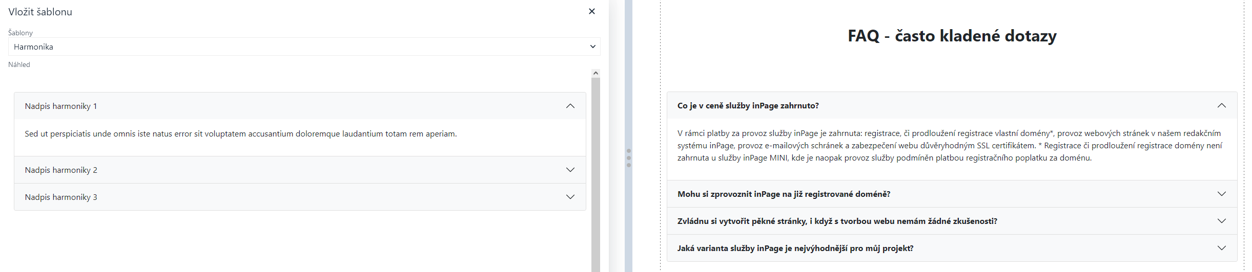 Pro tuto část stránky jsme v našem ukázkovém webu využili sekci Tři sloupce s obrázkem nahoře pro zobrazení zákaznických referencí a dále pak sekci s názvem Harmonika pro zobrazení odpovědí na často kladené dotazy neboli FAQ.