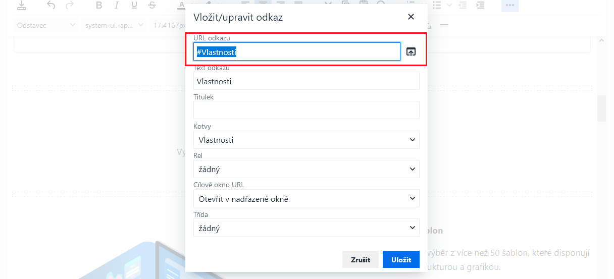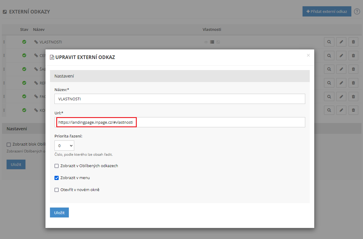 V našem konkrétním případě jsme vytvořili externí odkaz s názvem Vlastnosti a do pole URL vložili odkaz na kotvu - https://landingpage.inpage.cz/#vlastnosti