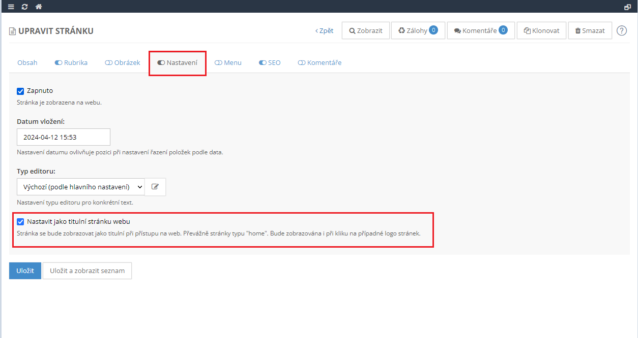 Aby vše fungovalo správně je potřeba námi vytvořenou stránku nastavit jako úvodní stránku webu. To provedete v editaci dané stránky, kde vyberete záložku /Nastavení/ a zde pak zaškrtnete možnost Nastavit jako titulní stránku webu a nastavení uložíte.