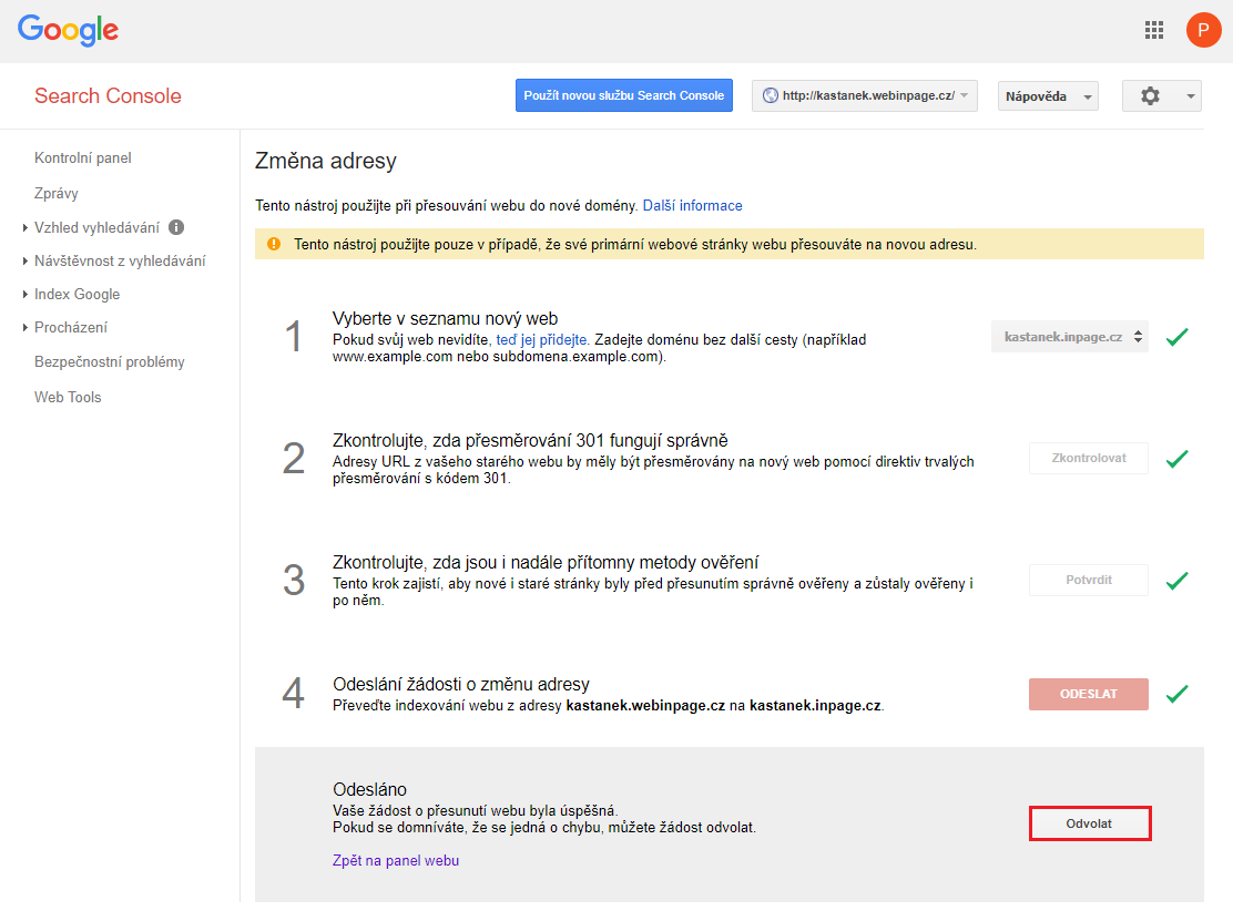 Funkce odešle hlášení o změně adresy. Během následujících 180 dní roboti google zaindexují nové stránky.
