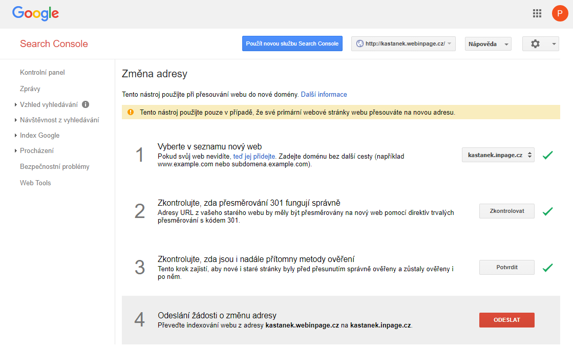 Funkce odešle hlášení o změně adresy. Během následujících 180 dní roboti google zaindexují nové stránky.