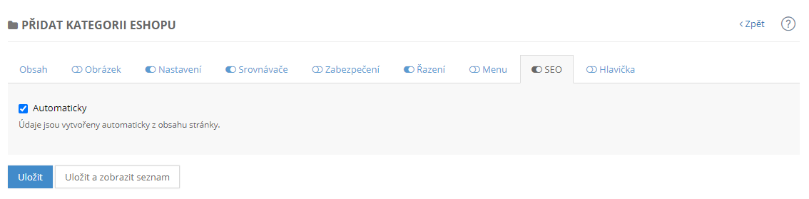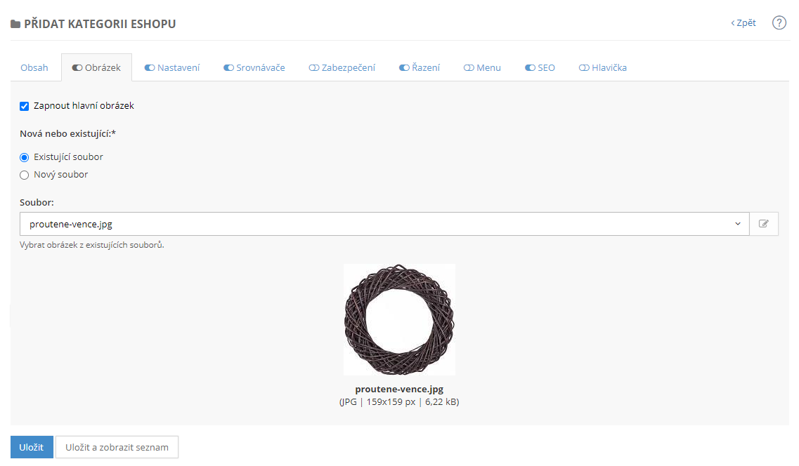 - Zapnuto - zaškrtnutím políčka bude kategorie aktivní a je možné ji zobrazit ve výpisu v e-shopu