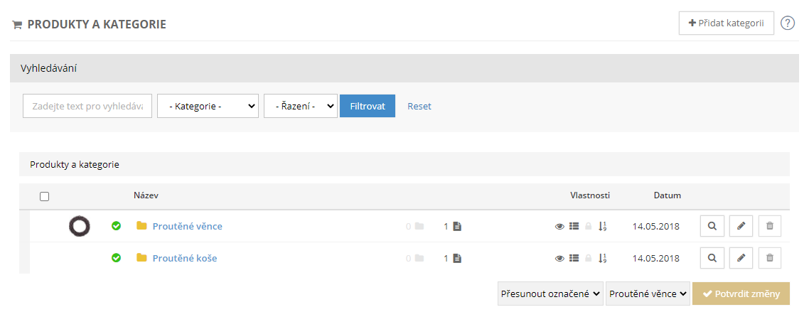 Kategorie jsou řazeny v přehledném seznamu, kde je možné jim měnit pořadí, upravovat je a také jsou u nich zobrazeny nastavené vlastnosti formou ikonek. Nechybí ani hromadné operace.