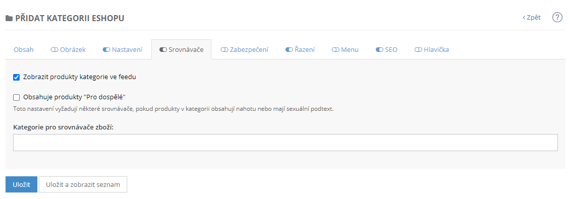 V této části lze vypnout zobrazení rubriky ve srovnávači zboží. Srovnávač Heuréka vyžaduje shodné názvy kategorií napojených e-shopů. V tomto případě stačí vyplnit políčko Kategorie pro srovnávače zboží. Možné je také zaškrtnout políčko Obsahuje produkty pro dospělé obsahují-li produkty nahotu nebo sexuální podtext.