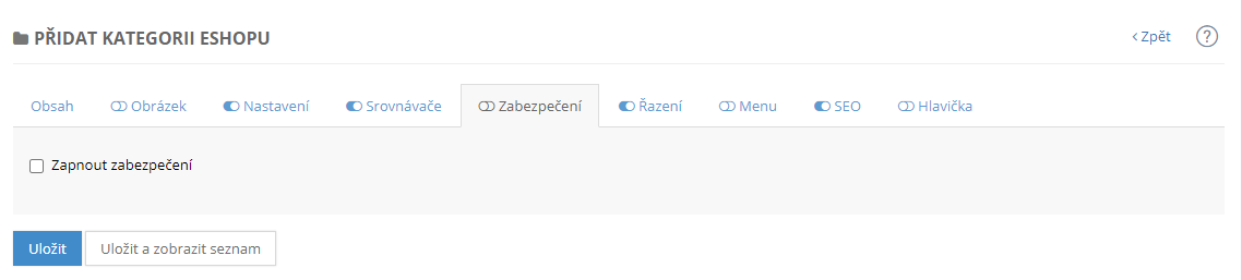 Kategorie může být také zabezpečená heslem a přístupná pouze pro vybrané zákazníky. Nastavení zabezpečené rubrika provedete zaškrtnutím políčka zapnout zabezpečení a zadáním hesla.