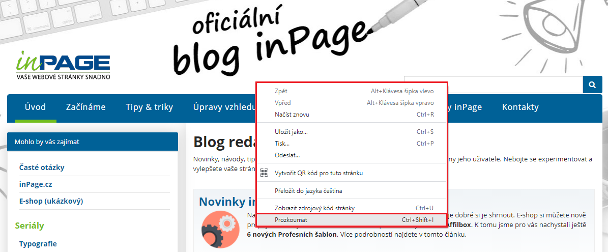 Pro zjištění této informace přejděte na vašem webu na stránku, kde chcete motiv změnit, a pravým tlačítkem myši klikněte do prostoru stránky. Zobrazí se nabídka možností, kde vyberete prozkoumat.