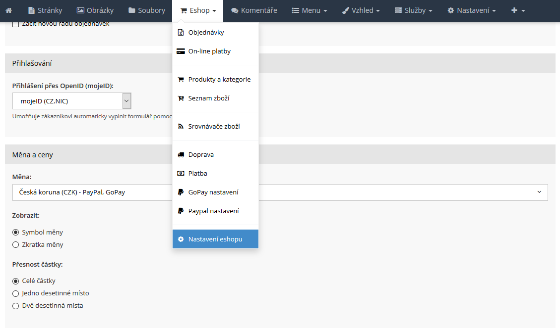 Měnu vašeho e-shopu si můžete nastavit v sekci /Eshop/ pod položkou „Nastavení eshopu“. Mimo jiné v této sekci najdete i přehled všech možností nastavení vašeho e-shopu.