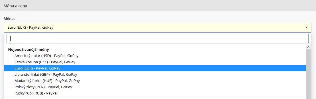 V administraci vašeho e-shopu si pro platební bránu GoPay či PayPal můžete nyní vybrat z vícero zahraničních měn. Vybírat si můžete například Americký dolar (USD), Libru šterlinků (GBP), polský Złoty (PLN), maďarský Forint (HUF) a ruský Rubl (RUB) *.